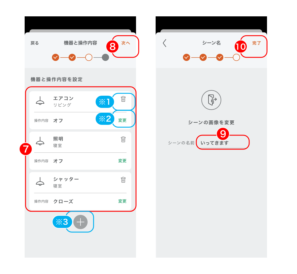 ※3)表示されている機器以外にも操作したい機器があれば、「+」アイコンから機器と操作内容を追加できます。