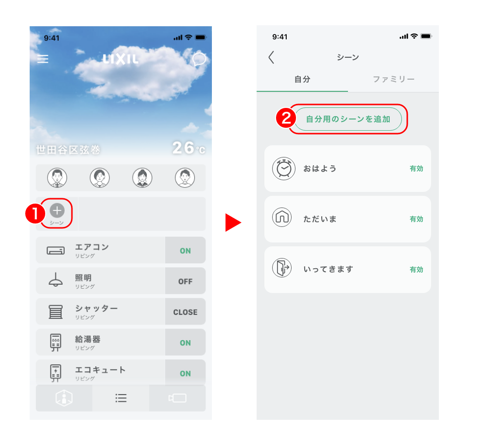 ※2)自分用のシーンとファミリー用のシーンの違いはシーンで出来ることをご参照ください。