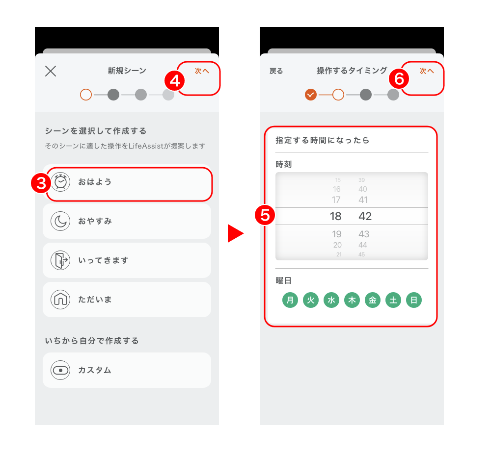 ※)おやすみシーンを平日(月曜日〜金曜日)だけ実行したい場合は、曜日の「土」「日」ボタンをタップしてグレーの状態にします。 - 「次へ」をタップします。
