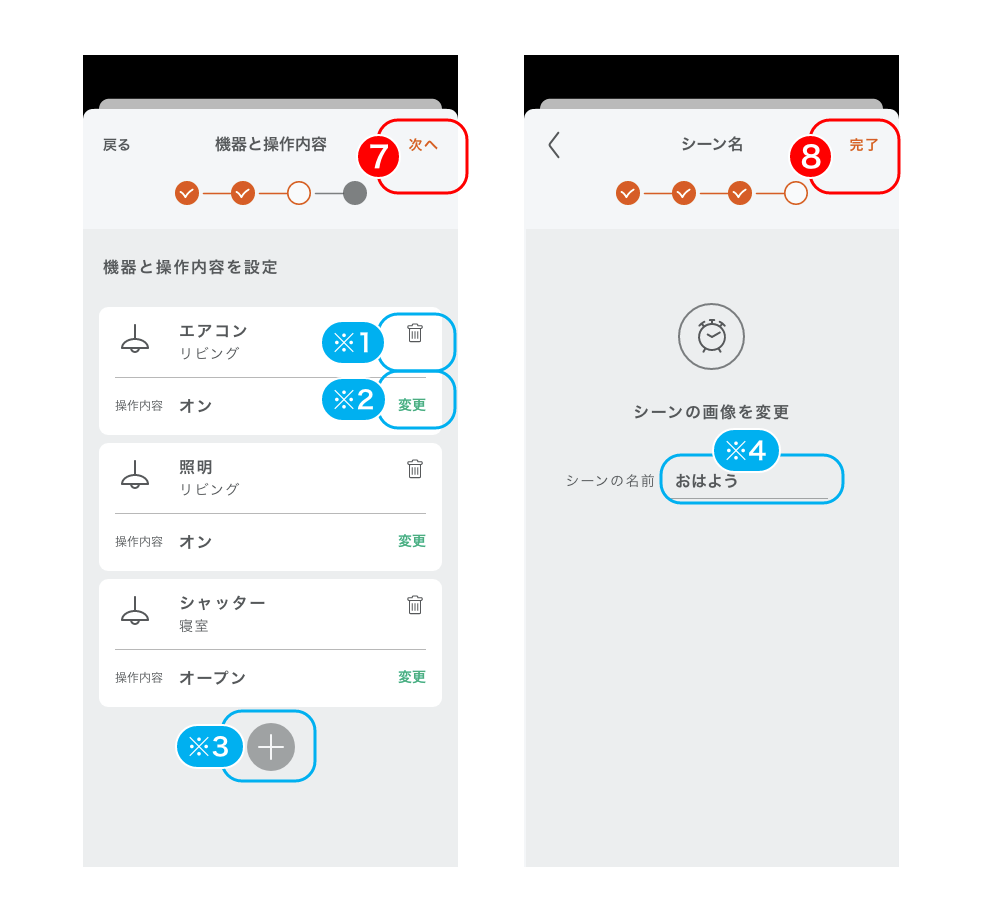 ※3)表示されている機器以外にも操作したい機器があれば、「+」アイコンから機器と操作内容を追加できます。