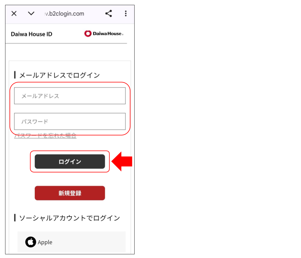 Daiwa Connectアプリにオーナー権限があるアカウントのメールアドレスとパスワードを入力し、「ログイン」をタップします。