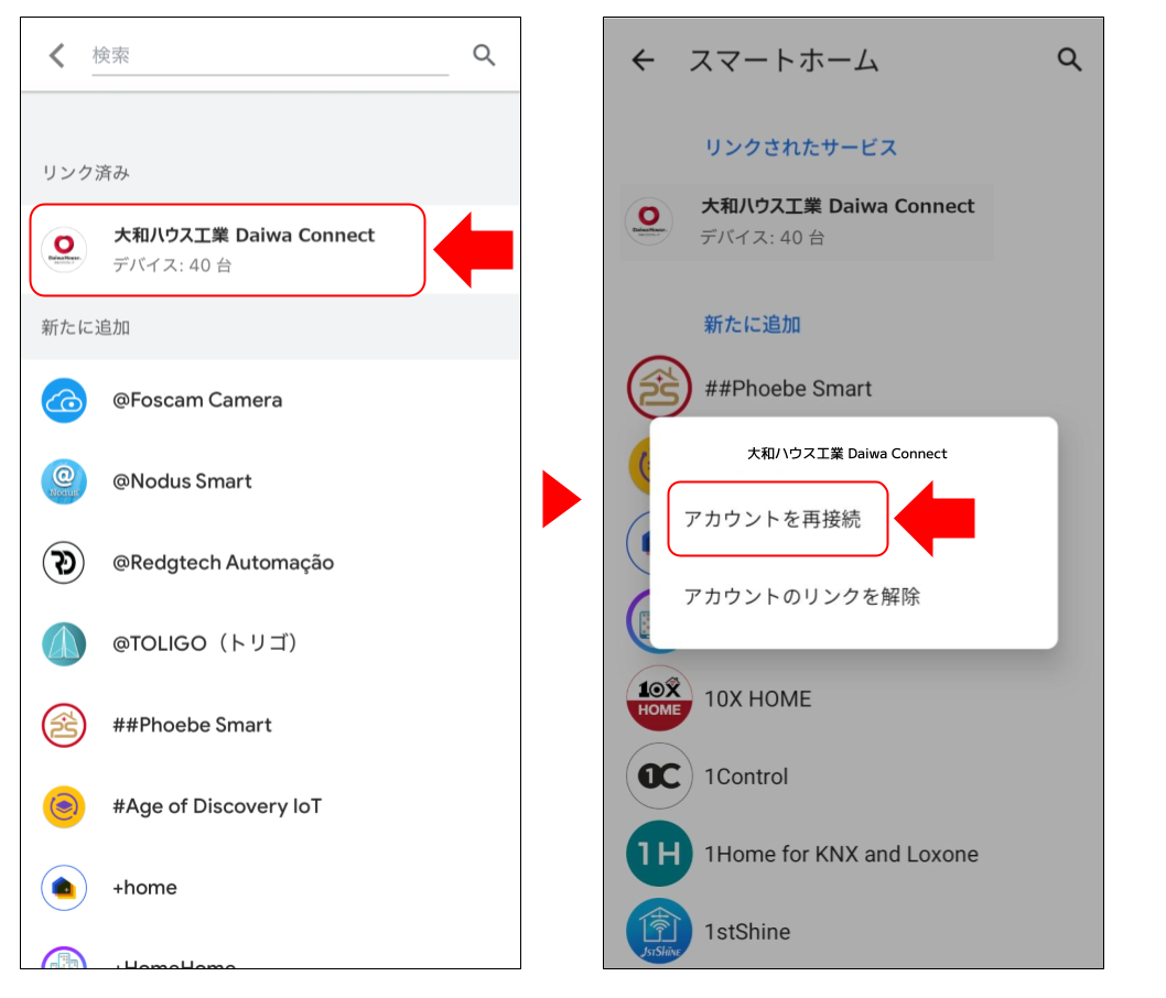リンク済みのアプリから「Daiwa Connect」をタップし、「アカウントを再接続」をタップします。