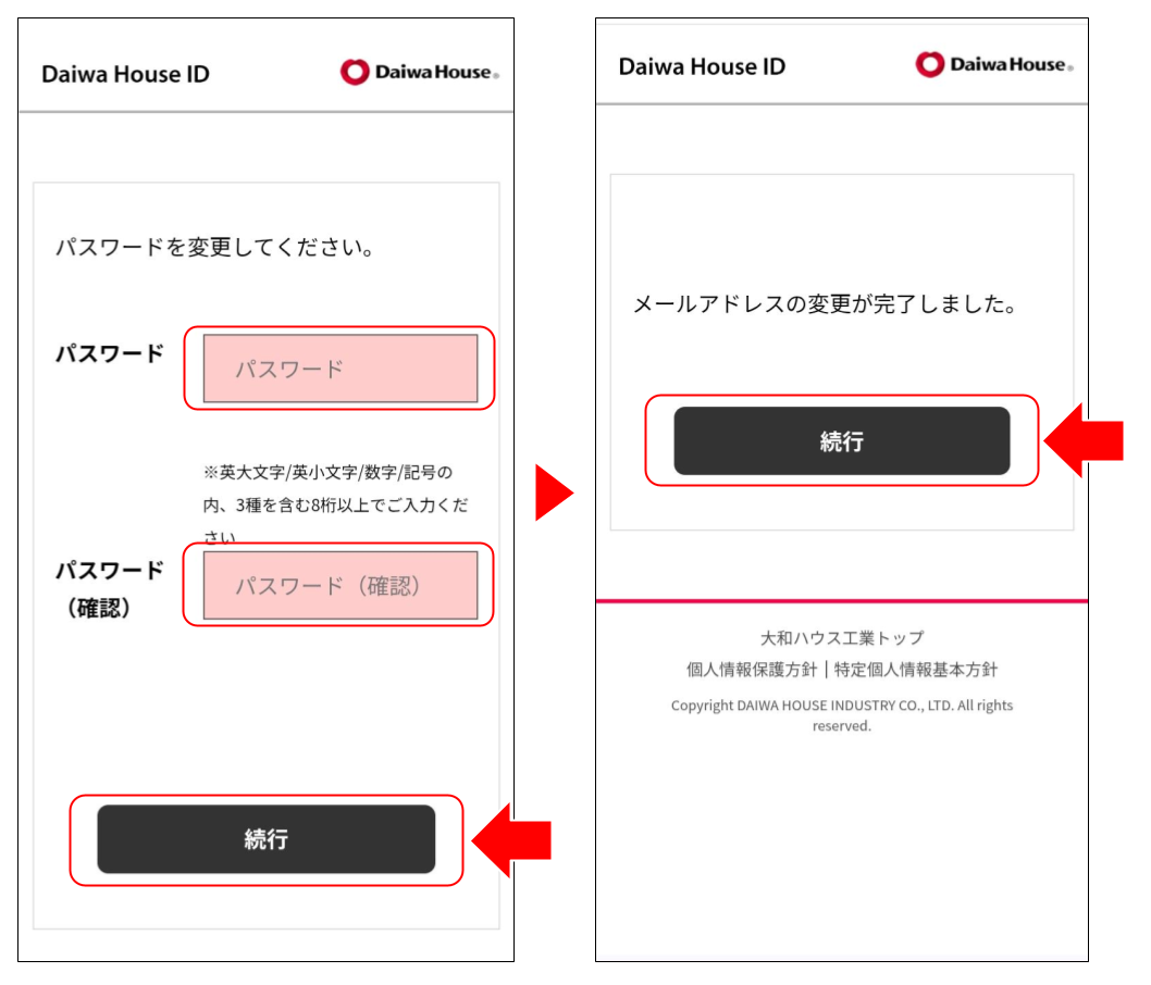 新しいパスワードを2ヶ所に入力し、「続行」をタップします。