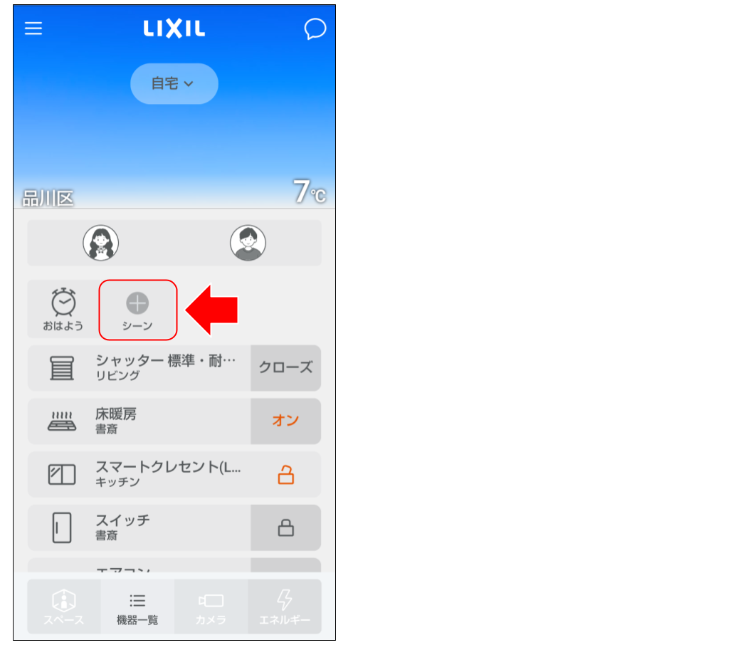 1.ホーム画面(機器一覧)にある「+(シーン)」アイコンをタップします。