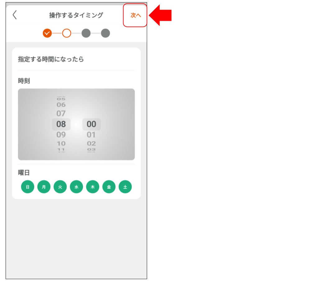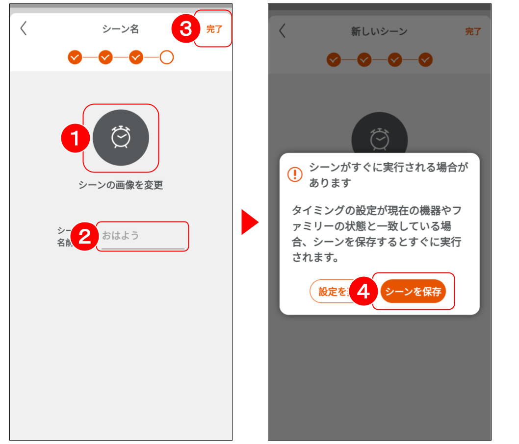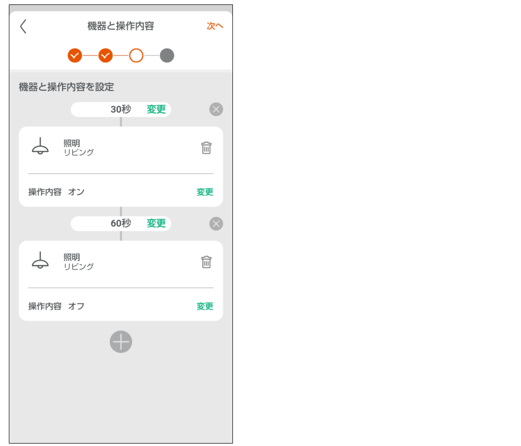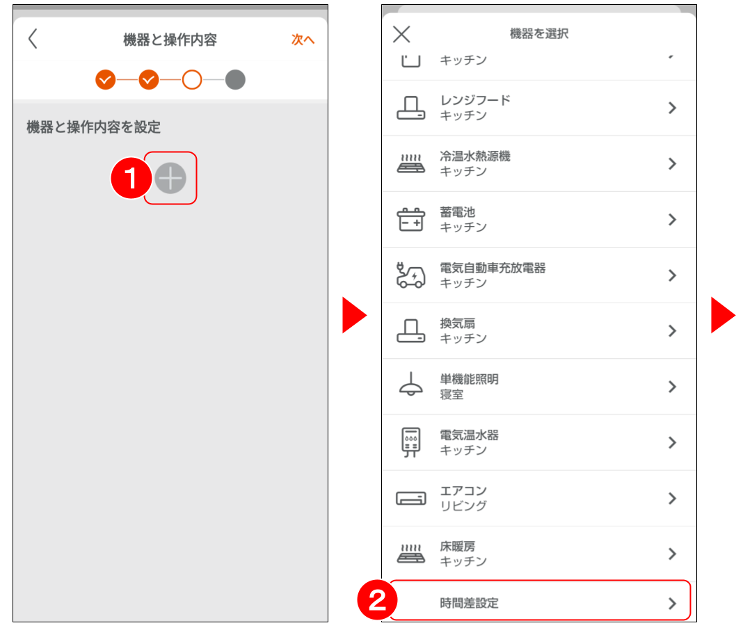 ①.「+」をタップすることで、機器の追加と時間差設定ができます。