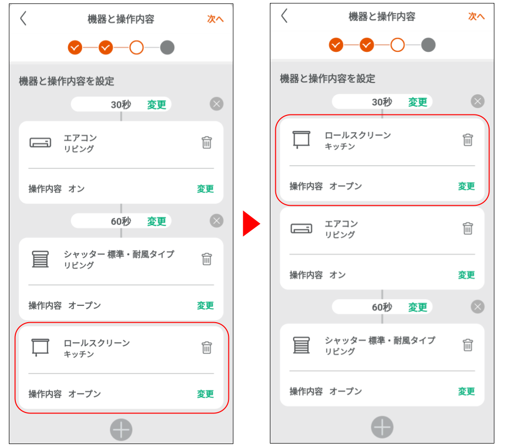 並び替えをしたい機器を指で長押ししたまま、変更したい位置に移動させ、指を離すと並び替えできます。