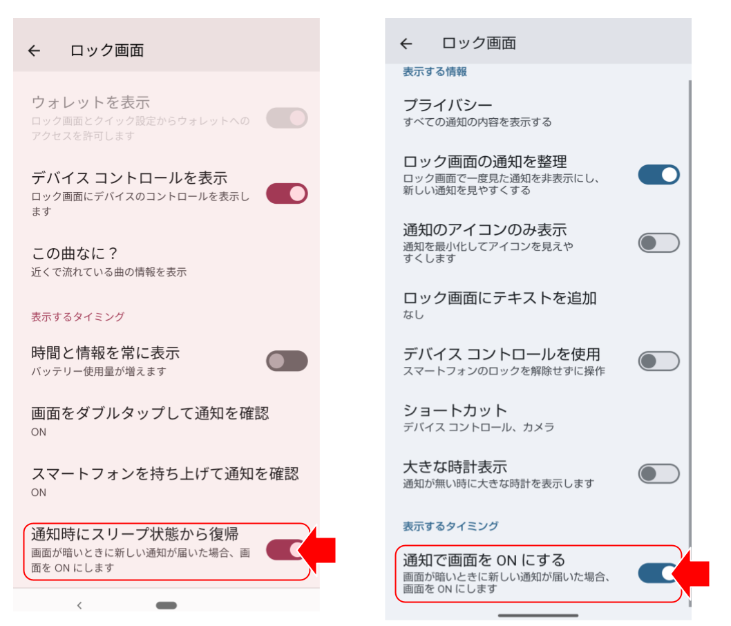 - 「通知時にスリープ状態から復帰」または「通知で画面をONにする」をオンにしてください。