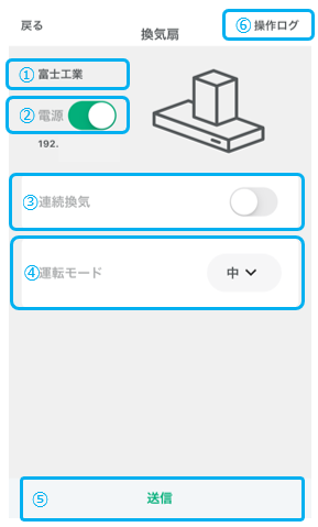 ⑤ | 送信ボタン | ②~④で設定した項目を空気清浄機へ送信します |