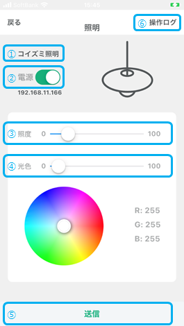 ⑤ | 送信 | ②~④で設定した項目を照明へ送信します |
