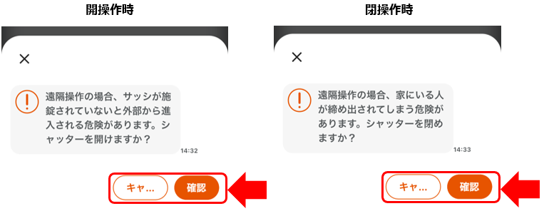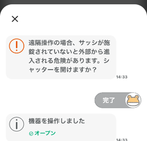 とじるボタンをタップするとシャッターが下降します。 - 開操作/閉操作を行うと以下の画面の通りメッセージが表示されます。