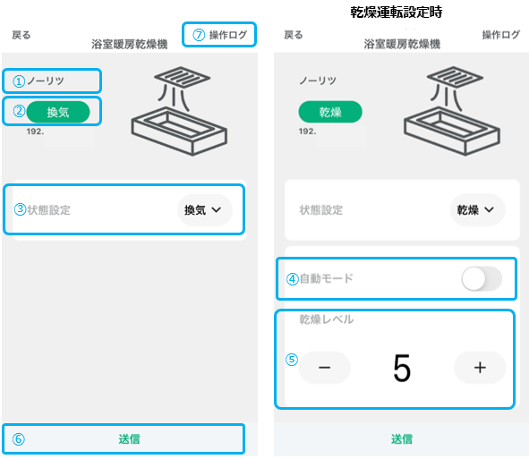 ⑥ | 送信ボタン | ②~⑤で設定した項目を浴室暖房乾燥機へ送信します |