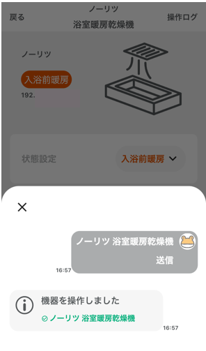 - 「送信ボタン」を押すと以下の画面の通り設定した情報が浴室暖房乾燥機に送信されます。