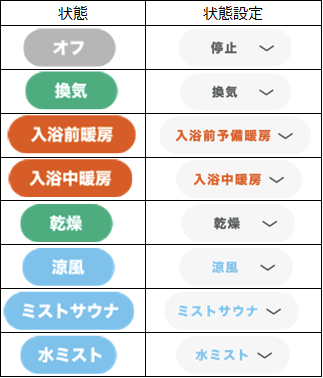 ③ | 状態設定 | 停止/換気/入浴前暖房/入浴中暖房/乾燥/涼風/ミストサウナ/水ミストへ変更できます |